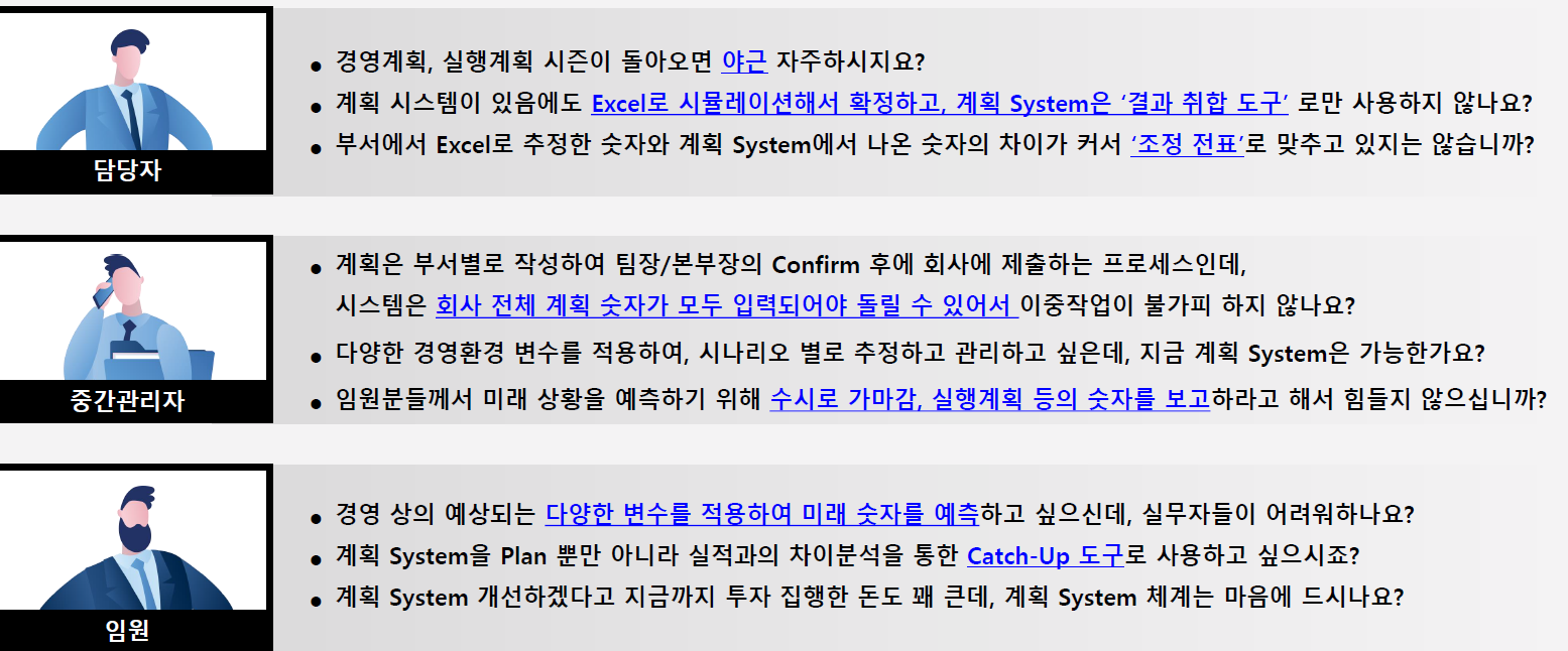 그 이유는 기존 Planning system이 복잡하고 어려운 수립체계로 구성되어 있고 산업별 특성에 맞는 비즈니스 케이스에 대응하기 힘든 구조로 되어 있어 실질적인 Planning system으로서의 역할을 제대로 하지 못하고 있기 때문입니다.