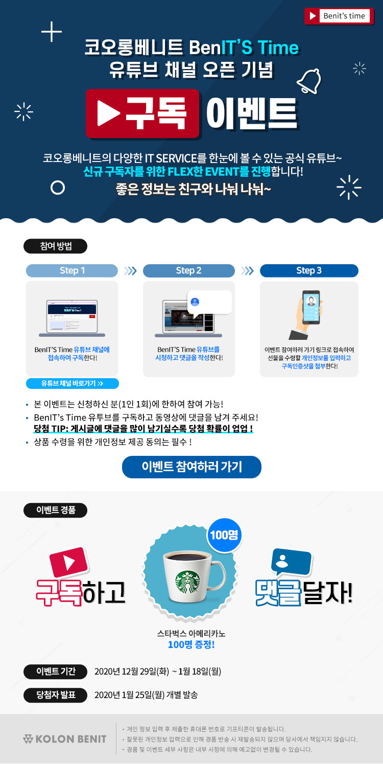 IT Service 공식 유튜브 오픈 구독 이벤트 IT Service 공유하기 게시글 관리 KOLON BENIT'S TIME 코오롱베니트의 다른 글도 만나보세요. '데이터 기반의 제조현장 혁신 전략 및 사례' 웨비나에 초대합니다! 2023.06.28 코오롱베니트의 '성공적인 ERP Data Migration 전략' 웨비나에 초대합니다! 2023.05.24 [이벤트 종료] BENIT'S TIME 블로그 리뉴얼 이벤트 2020.09.28 블로그 방문 감사 이벤트 당첨자 발표 2020.07.17 홈페이지 문의사항 뉴스레터 티스토리툴바