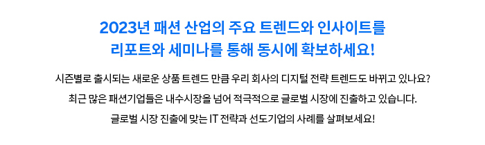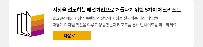 패션 산업의 주요 트렌드와 인사이트가 궁금하신가요? 시장을 선도하는 패션기업으로 거듭나기 위한 시크릿 비법을 준비했습니다. 패션 산업 트렌드 리포트와 온라인 무료 세미나를 통해 확인해보시기 바랍니다.