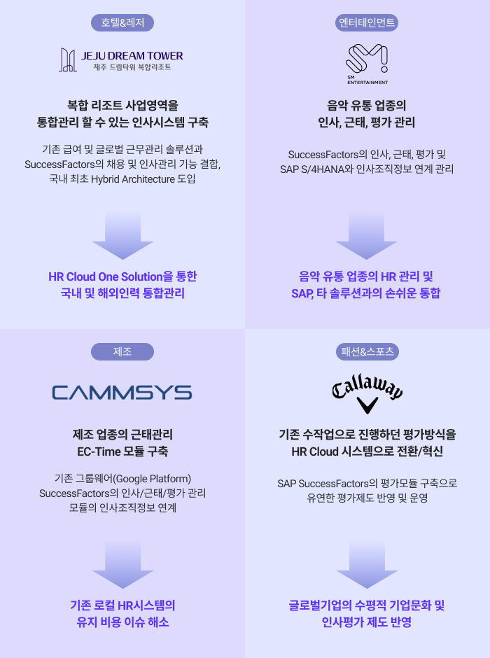 HR 전 영역 통합 솔루션, 최고의 직원 경험, 유연성 확보, 인사 및 재무 연계, Risk/복잡도 최소화, 효율성/효과성 향상이라는 특징을 갖고 있습니다.