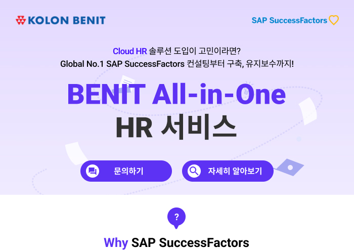 코오롱베니트는 SAP SuccessFactors 컨설팅부터 구축, 유지보수까지 A to Z를 진행하는 All-in-One HR 서비스를 제공하고 있습니다. SAP Gold Partner로서 코오롱 그룹사 구축 경험을 토대로 서비스, 제조, 금융 등 다양한 산업군에서의 HR 솔루션 사업 수행 경험을 가지고 있습니다. SAP SuccessFactors와 연계된 자체 근태 급여 Cloud 솔루션인 HRWORX를 보유하고 있습니다.