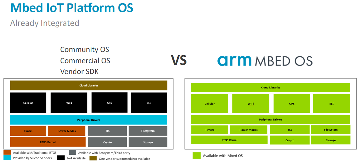 Mbed OS는 단수 RTOS가 아닌, IoT를 위한 Platform이라고 말씀 드리고 싶습니다. Embedded용 RTOS는 타사에도 비슷하게 제공해 주고 있습니다. 하지만 예를 들어 무료 OS, 상업용 OS 또는 Vendor사에서 제공해주는 SDK를 가지고 개발을 진행해야 한다면, 이 소프트웨어는 기본적으로 RTOS Kernel 부분만 제공 되는게 일반적입니다. 나머지 부분인 보안이나, 파일시스템은 ThirdParty를 이용해야 하며, 네트웍 연결을 위해서 Cellular, WiFi, GPS 기능들은 새롭게 개발 해야 합니다.
