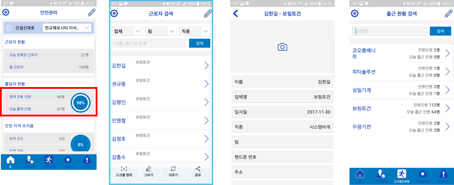 코오롱베니트 홍재인식 솔루션은 현장 근로자 및 협력업체를 구분하여 관리 할 수 있고, 구역별 설정에 따라 현장에 근무하고 있는 인원 파악도 가능하여 그 동안 수기로 관리 했던 인력관리도 자동화하여 효율적으로 관리 할 수 있습니다.