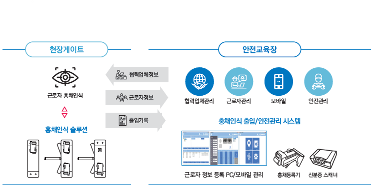 이에 따른 대응으로 바이오 기술과 ICT 기술이 접목된 생체인식 솔루션이 곳곳에 적용되어 건설현장의 출입통제에 효율적으로 사용되고 있습니다. 생체인식은 (홍채인식, 얼굴인식, 정맥인식 등) 정확한 본인확인이 가능하고, 빠른 인식율과 보안성이 뛰어난 출입통제 시스템으로 주목받고 있습니다.