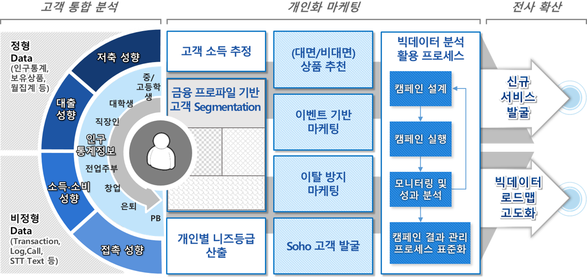 은행 · 카드사 · 보험사 등 우리가 일상 생활에서 흔히 접하는 금융산업에서의 빅데이터 활용은 어떠할까요? 일반적으로 금융산업은 대다수의 국민들이 이용하고 있습니다. 그리고 카드 상품, 예·적금 상품, 방카슈랑스, 생명·손해 보험 등 금융 산업은 상품의 종류도 많아 데이터의 유입량이나 보유량이 광대하고 데이터가 축적되는 속도도 빠릅니다. 이에 따라 그 어느 산업에 비해서 빅데이터의 활용범위가 다양하고 활용가치가 높게 측정되고 있습니다. 금융산업에서의 데이터 활용은 다양한 영역에서 살펴볼 수 있는데 크게 네 가지 영역에서 살펴보겠습니다.