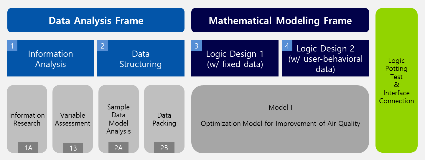 전체적인 분석 프레임워크 (Analytics Framework)는 Data Analysis와 Mathematical Modeling 으로 구성되며 Data Analysis는 정보추출과 데이터 정제 및 가공을, Mathematical Modeling은 수학적 모델링을 통한 로직 도출을 실행합니다.
