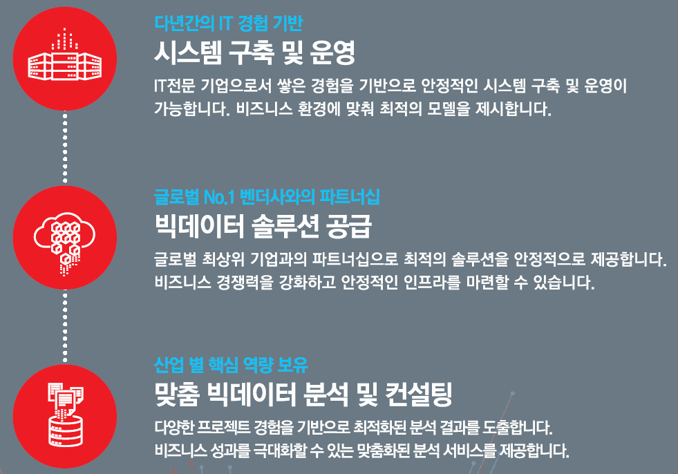 또한 유수 벤더사와의 파트너십 (Cloudera, AWS/Azure/GCP)을 통해 빅데이터 시스템 구축/운영, 빅데이터 분석, 빅데이터 솔루션 공급까지 엔터프라이즈 빅데이터 통합 서비스를 제공합니다