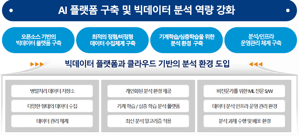 기업내 산재되어 있는 정형/비정형 데이터(ERP 데이터, 생산 데이터, 고객 데이터, 소셜 데이터등)를 활용한 빅데이터 분석을 통해 고객 중심의 비즈니스를 발굴하고 디지털 비즈니스의 강화를 목적으로 고성능 빅데이터 플랫폼과 클라우드 기반의 데이터 분석 환경을 구축하고자 하였습니다.